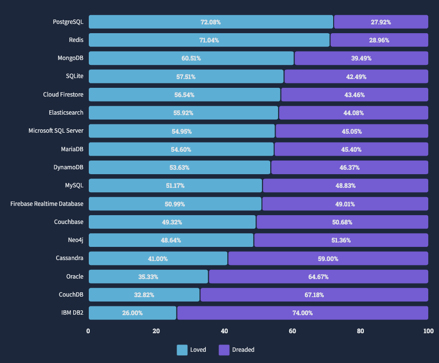 2022년 StackOverflow Developer Survey 에서 Databases 항목에서 인상적인 것을 확인할 수 있습니다.