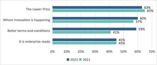 그 이유로는 오픈소스 기술로의 전환이 비용 절감(응답자의 63%), 혁신(60%), 약관 개선(59%) 같은 요인에 의해