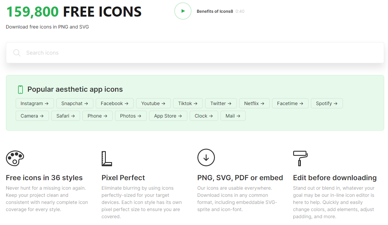 아이콘스8은 159,800개의 무료 아이콘들을 공유하는 사이트입니다.