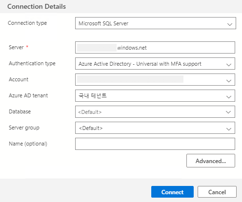 Azure DB 연결정보를 입력합니다.